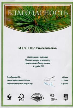 В апреле 2021 года тридцать обучающихся МОБУ «Средняя общеобразовательная школа Лесозаводского городского округа с. Иннокентьевка» приняли участие в Интернет-конкурсе по лесоводству среди школьников Приморского края.