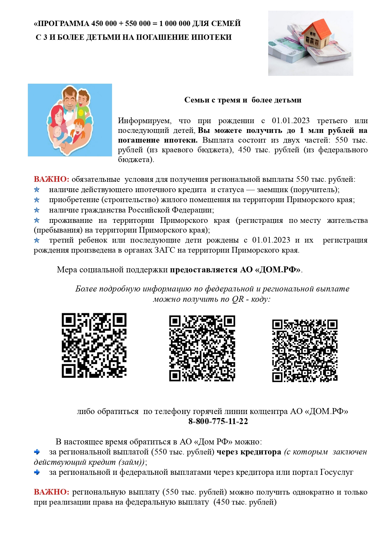 Информируем, что при рождении с 01.01.2023 третьего или последующий детей многодетные семьи, проживающие в Приморском крае, могут получить более 1 млн рублей на погашение ипотеки.