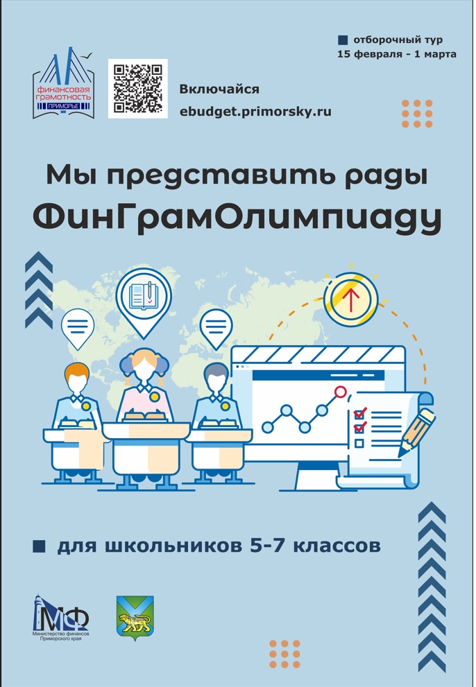 15 февраля начнется прием заявок на участие в краевой Олимпиаде школьников по финансовой грамотности. Проведет интеллектуальное состязание министерство финансов ПК.Срок проведения Олимпиады: с 1 марта 2023 года по 28 апреля 2023 года. Олимпиада проводится в два этапа: первый (отборочный) этап проводится в дистанционном формате; второй (заключительный) этап проводится очно 23 марта 2023 года по адресу: Приморский край, г. Владивосток, ул. Светланская, д. 22.